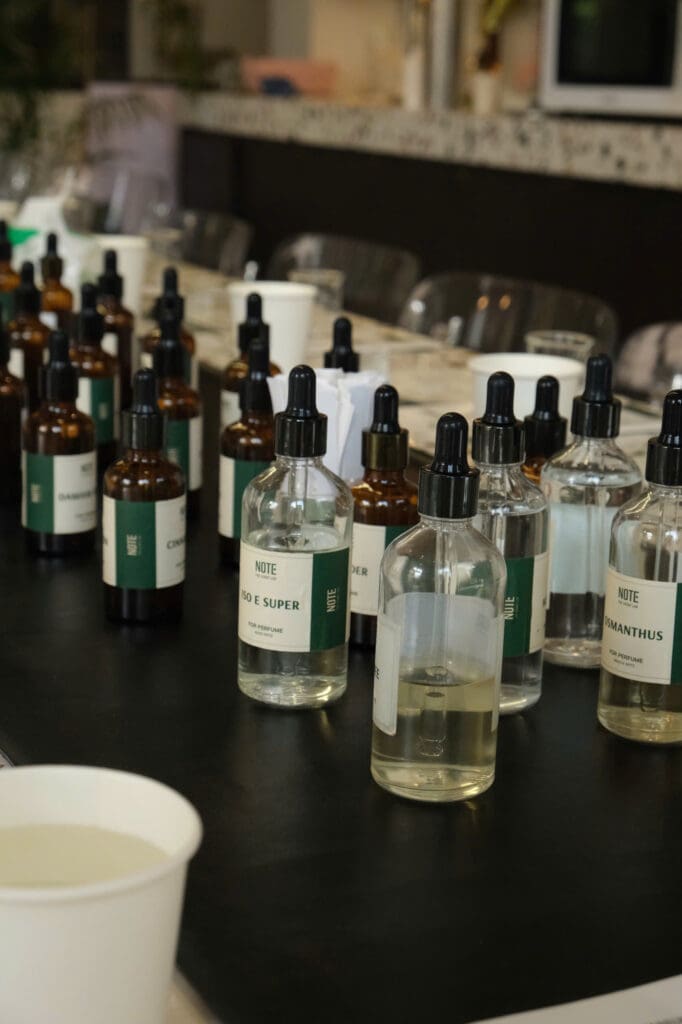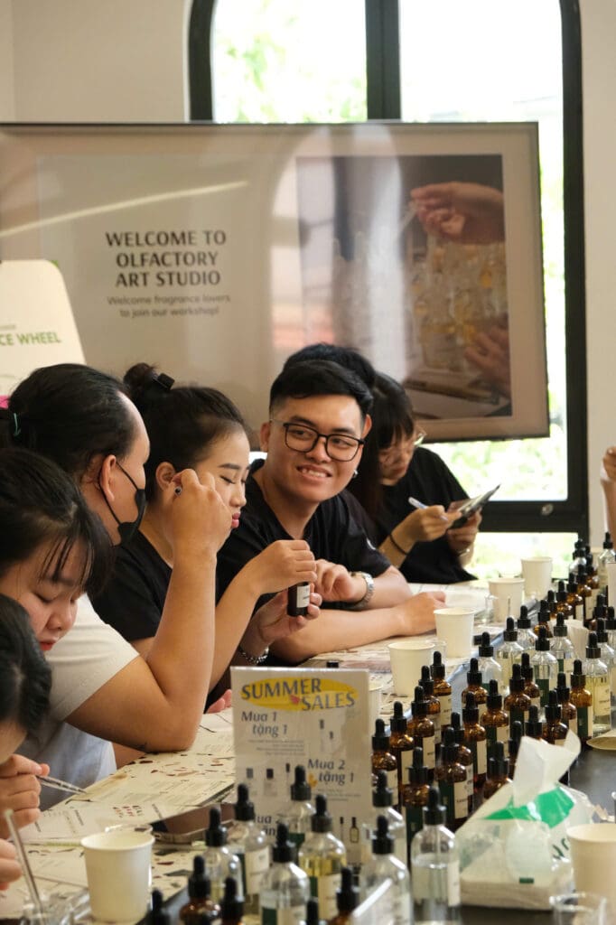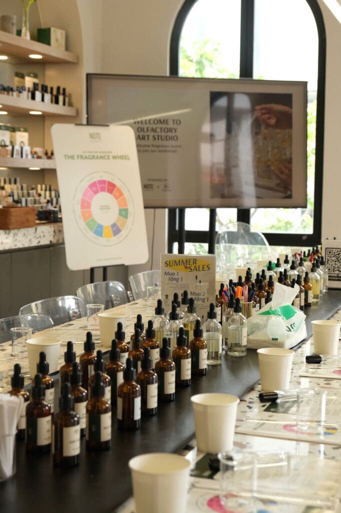 Trước giờ G, NOTE đã hoàn thiện không gian workshop doanh nghiệp với sự chuẩn bị kỹ lưỡng đến từng chi tiết. Với bàn ghế được sắp xếp gọn gàng, sạch sẽ, trang bị đầy đủ nguyên liệu và dụng cụ cần thiết. Các lọ tinh dầu được dán nhãn rõ ràng, bảng hướng dẫn thiết kế riêng giúp người tham gia dễ dàng làm quen với quy trình chế tạo mùi hương. Đặc biệt, không gian workshop thoáng mát, sạch sẽ, được khử trùng và điều hòa ổn định, kết hợp cùng ánh sáng tự nhiên, đã tạo nên một môi trường lý tưởng để thả lỏng tinh thần và đắm chìm trong trải nghiệm.
