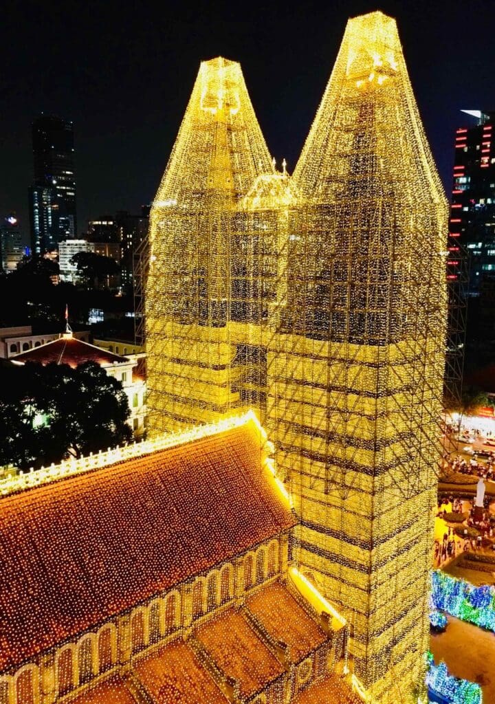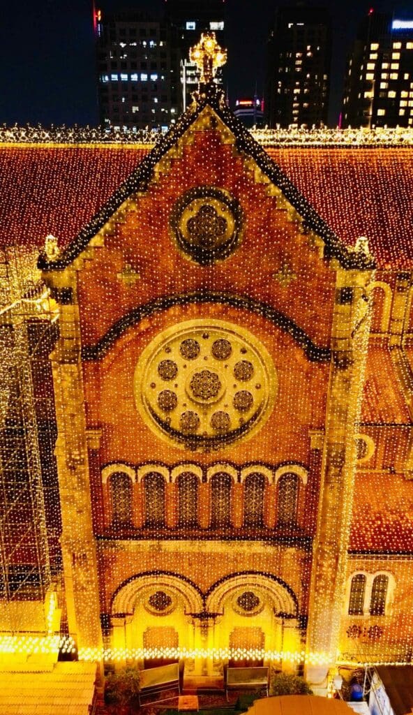 Với hơn 500.000 m dây đèn LED được trang hoàng xung quanh công trình và 2 tháp chuông, bạn hãy ghé Nhà thờ Đức Bà vào buổi tối khi các ánh đèn đã được thắp lên để có thể chiêm ngưỡng toàn bộ vẻ đẹp nơi đây trong bầu không khí Giáng Sinh năm nay nhé. Ngoài ra, bạn cũng có thể tham dự chương trình Thánh Lễ đêm mừng Chúa Giáng Sinh được tổ chức vào ngày 24 và 25/12 để cùng hòa chung vào không khí trang nghiêm, cảm xúc cùng các giáo dân tại TP.HCM.