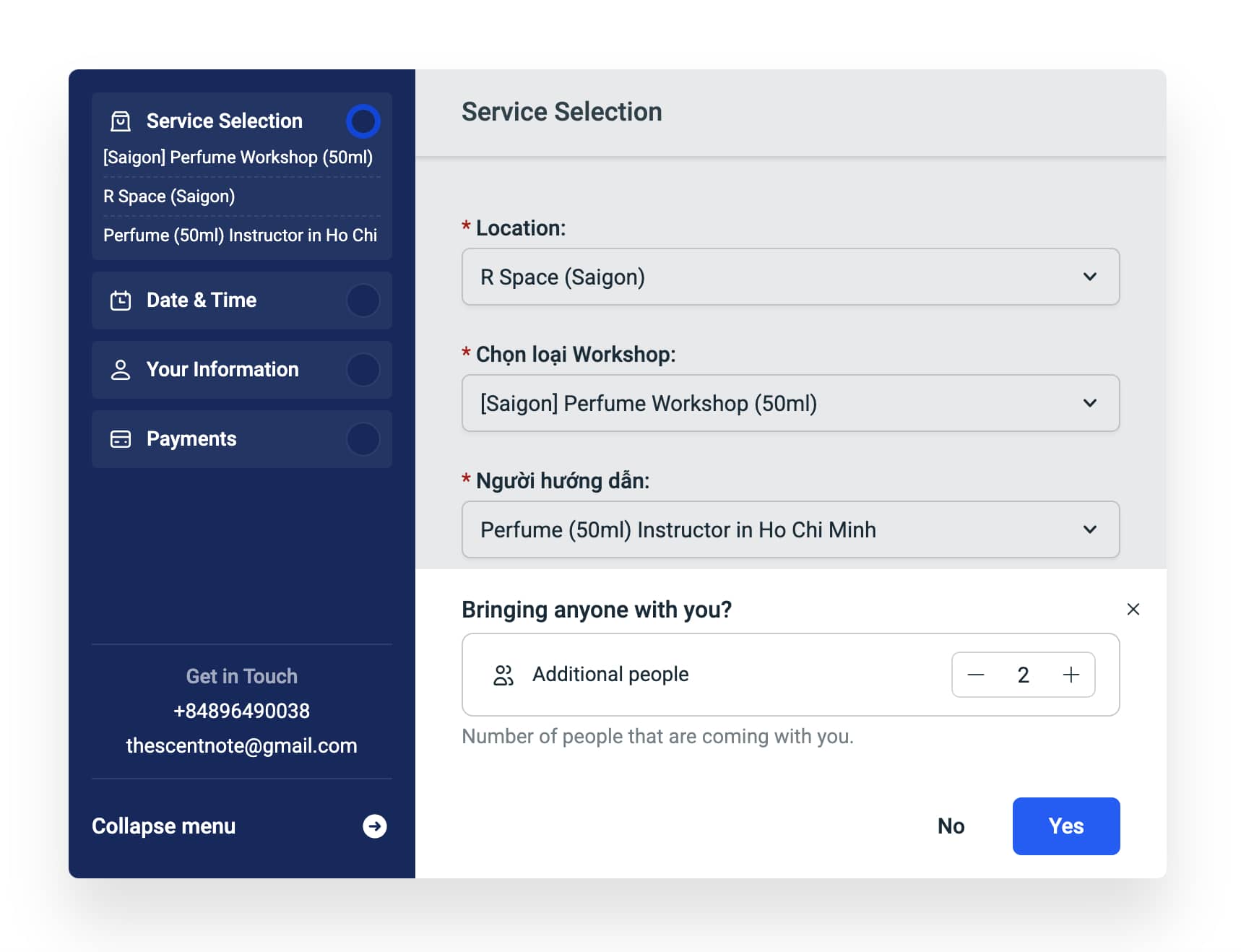 Bước 1: Truy cập vào link https://r-workshop.space/book-a-workshop/. Và điền các thông tin cần thiết cùng số lượng người đi cùng → Chọn Yes.