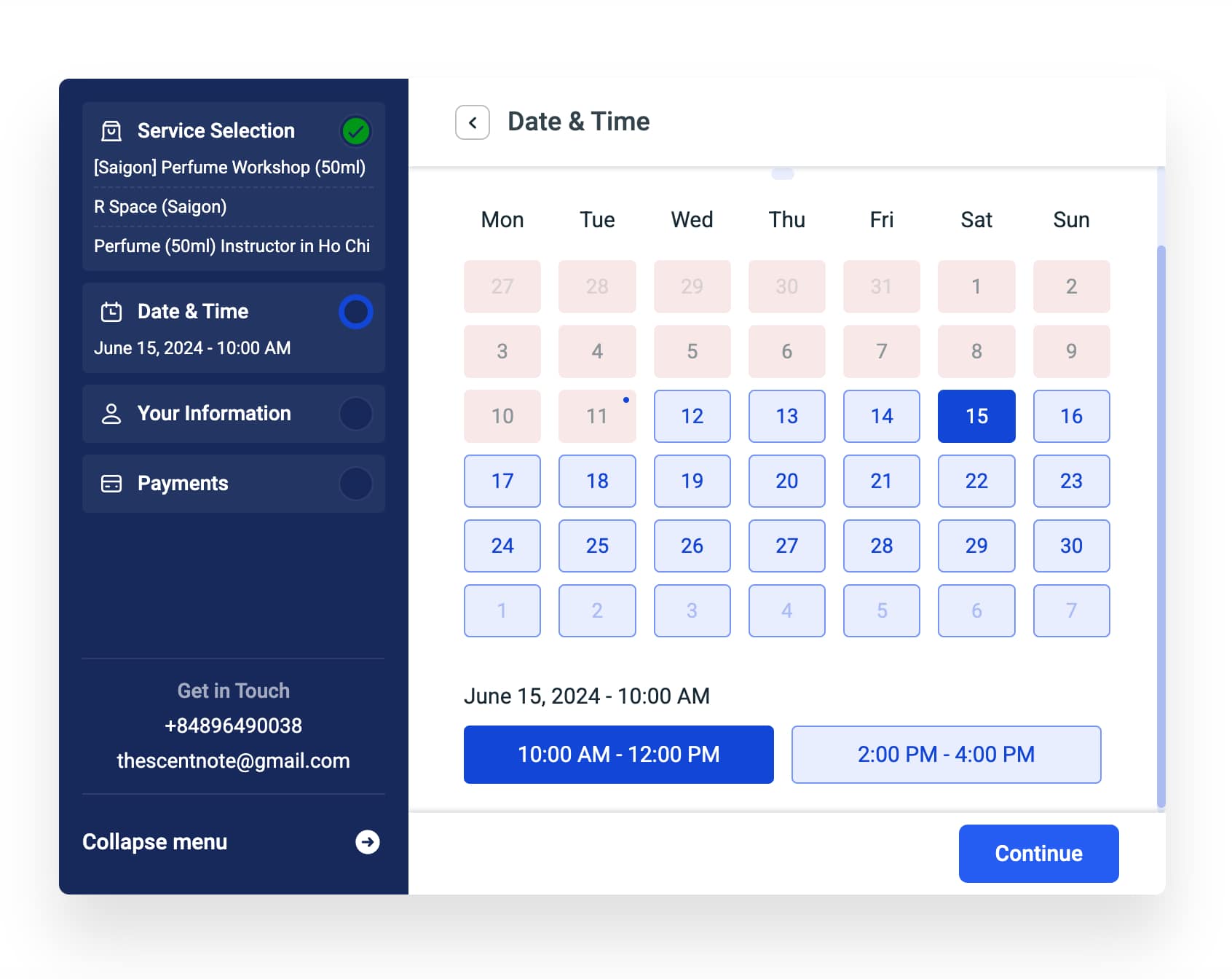 Bước 2: Chọn ngày tháng và khung thời gian bạn muốn tham gia Workshop → Chọn Continue.