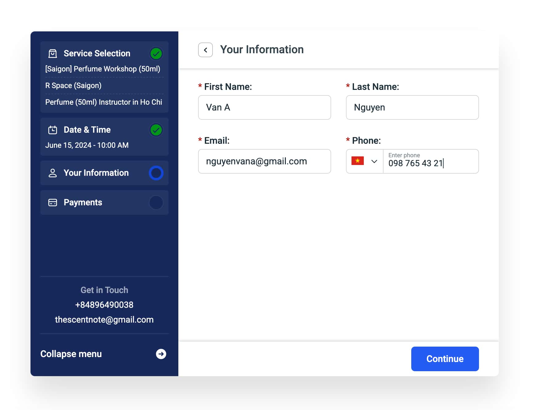 Bước 3: Điền thông tin của người đăng ký Workshop → Chọn Continue.