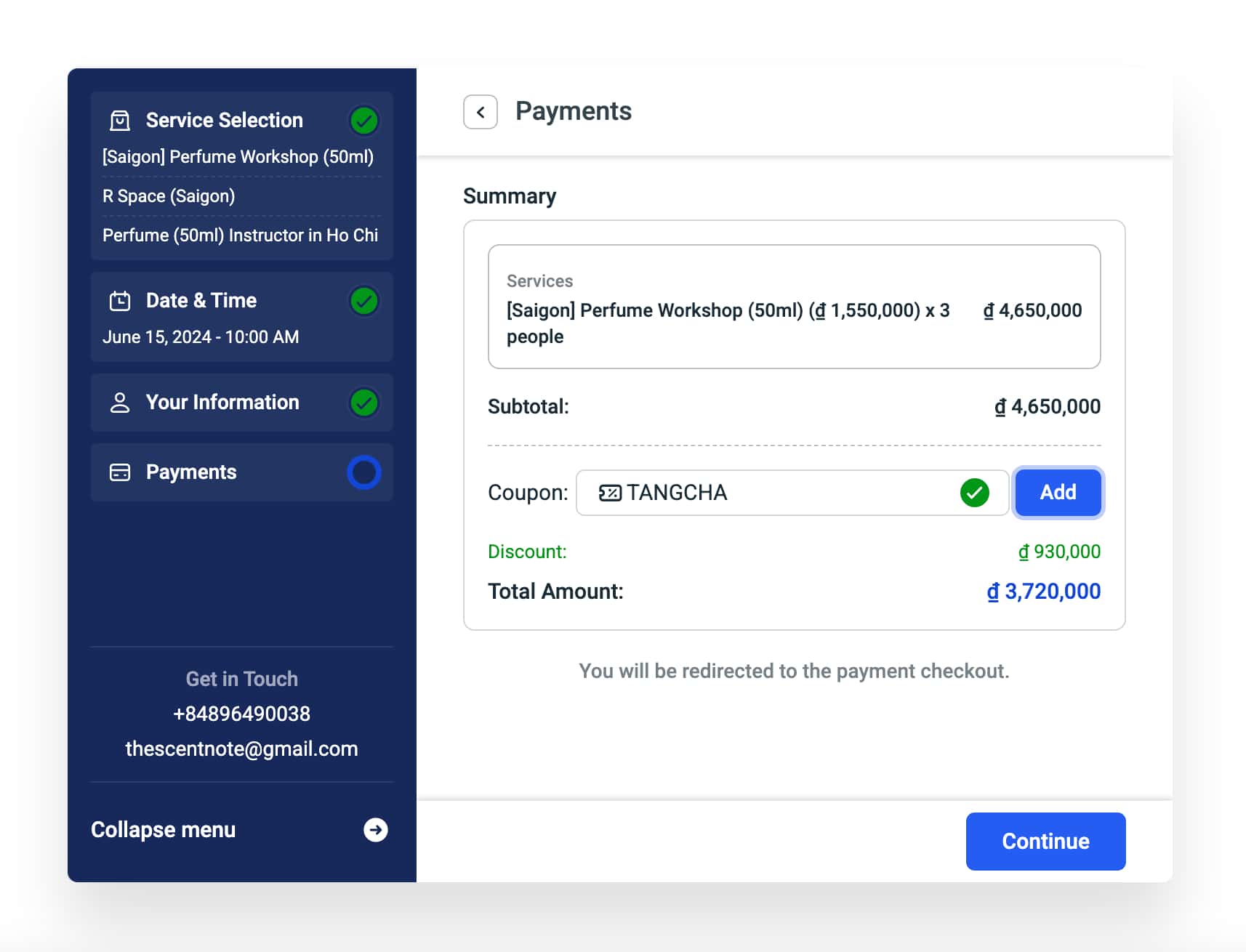 Bước 4: Nhập mã TANGCHA (viết in hoa) → Chọn Add để được giảm giá → Chọn Continue và tiến hành thanh toán.